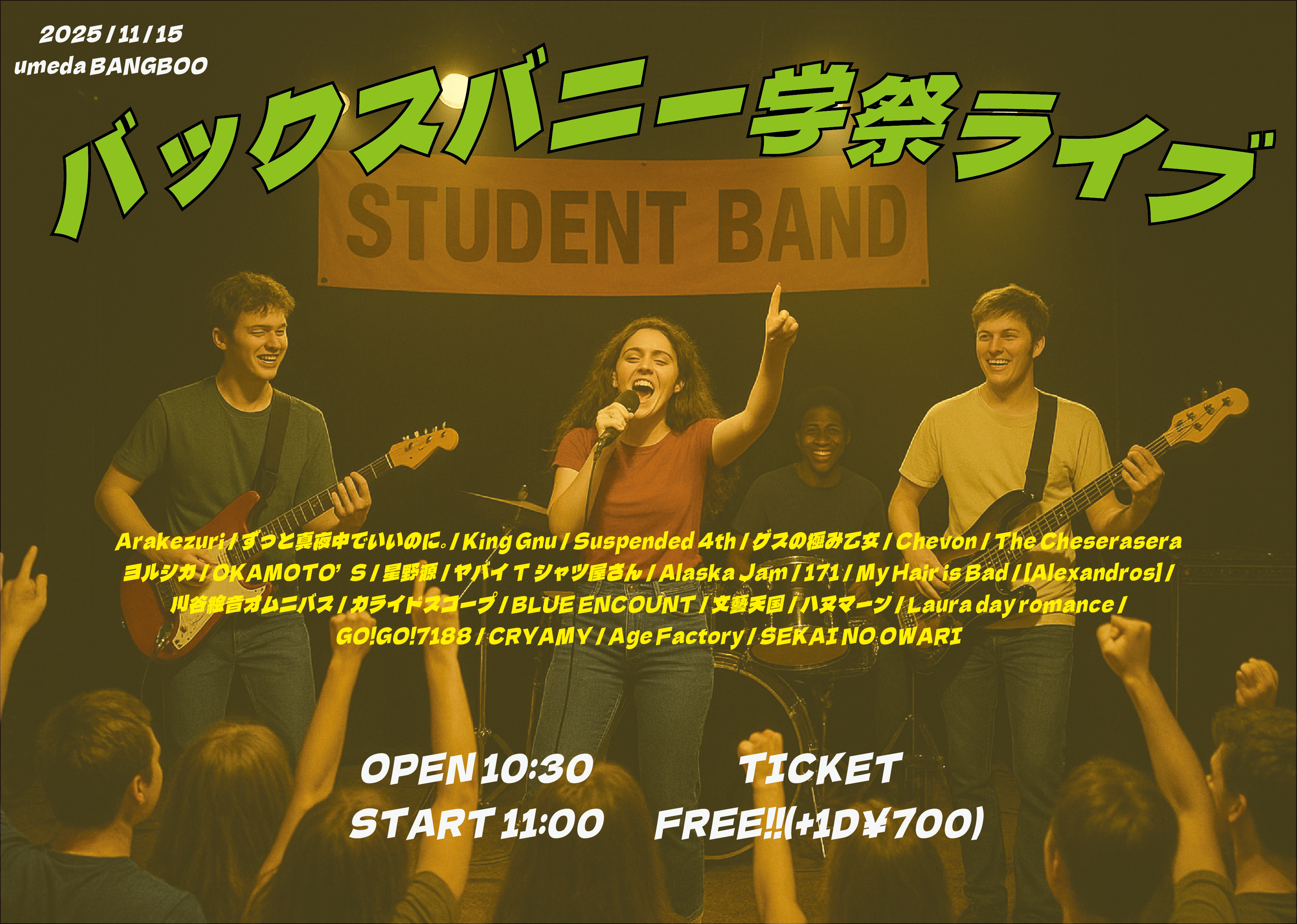 梅田 BANGBOO スケジュール 2025.11.16(Sun) バックスバニー学祭ライブ@BANGBOO [ACT] 素敵students [OPEN/START] 10:30/11:00 [料金] ADV./DOOR ¥FREE/¥別FREEDOM途Drink代¥700 会場販売:無 (問)梅田BANGBOO info@bangboo.jp 06-6867-7828 〒530-0027 大阪府大阪市北区堂山町6-5 ペンギンスクエアビルB1F、B2F