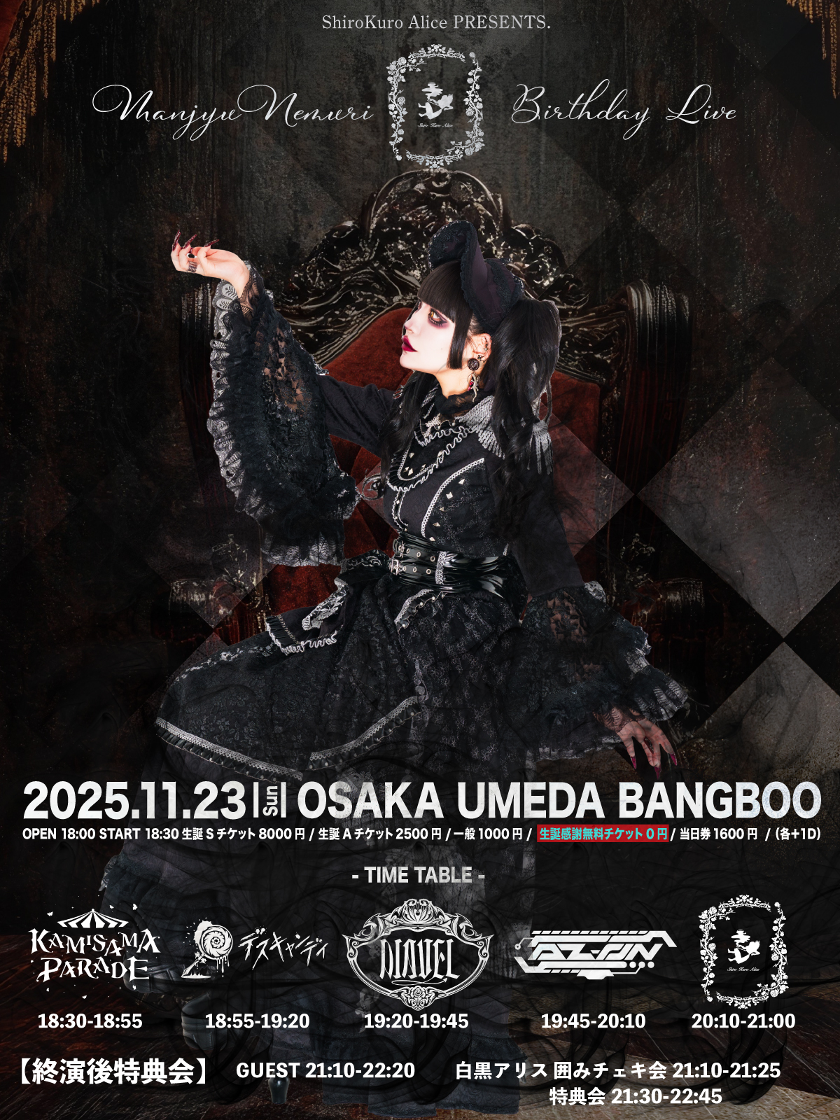 - 料金:生誕Sチケット8000円(1D) / 生誕Aチケット 2500円(1D) / 一般1000円(1D) / 数量限定生誕無料チケ0円(1D) / 当日券1600円(1D) チケットURL:https://tiget.net/events/439888