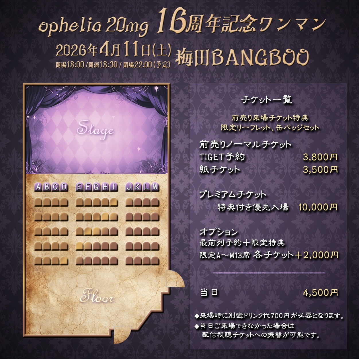- TIGET 3,300円+1ドリンク ノーマルチケット 3,000円+1ドリンク プレミアムチケット 10,000円+1ドリンク ※紙チケットはご来場が難しくなった場合、配信に振替可能 前列指定席 2,000円(全13席) ※紙チケットをお持ちの方のみ購入可 【配信】3,500円 https://premier.twitcasting.tv/bangbooinfo/shopcart/4217