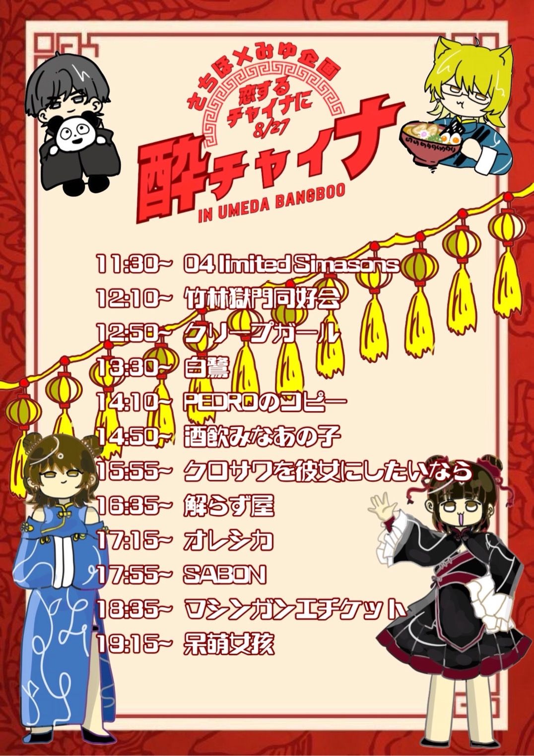 梅田 BANGBOO スケジュール 2025.8.27(Wed) さちほみゆ企画 [ACT] 04 limited Simasons / 竹林獄門同好会 / クリープガール / 白鷺 / PEDROのコピー / 酒飲みなあの子 / クロサワを彼女にしたいなら / 解らず屋 / オレシカ / SABON / マシンガンエチケット / 呆萌女孩 [OPEN/START] 11:10 / 11:30 [料金] FREE(+1D¥700-) 会場販売:無 (問)梅田BANGBOO info@bangboo.jp 06-6867-7828 〒530-0027 大阪府大阪市北区堂山町6-5 ペンギンスクエアビルB1F、B2F