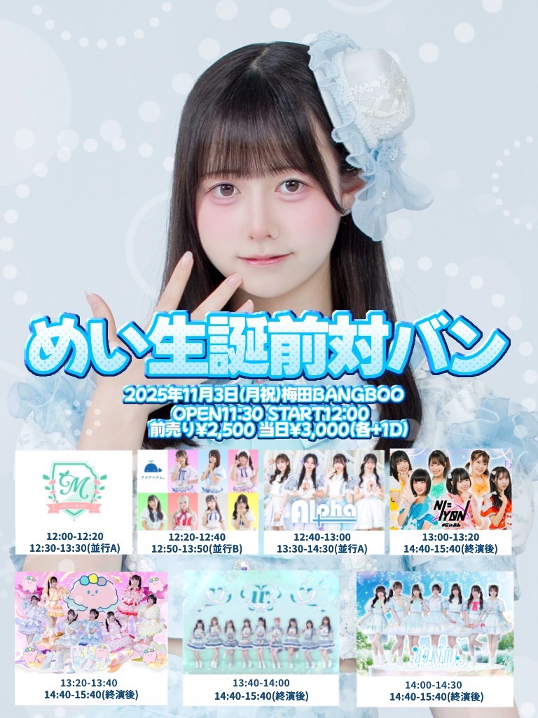 梅田 BANGBOO スケジュール 2025.11.03(Mon) 『めい生誕前対バン』 [ACT] あおぞらをキミに / W.ダブルヴィー / NI=YON(#にぃよん) / 脳内パステル / ちょこみんと / アクアリウム。 / +Alpha [OPEN/START] OPEN 11:30/START 12:00 [料金] 前売り ¥2,500 / 当日 ¥3,000 (各1D代) https://tiget.net/events/437919 会場販売:無 (問)梅田BANGBOO info@bangboo.jp 06-6867-7828 〒530-0027 大阪府大阪市北区堂山町6-5 ペンギンスクエアビルB1F、B2F