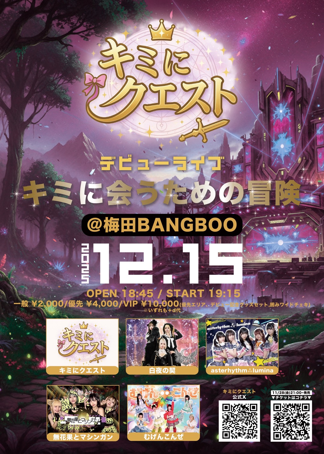 梅田 BANGBOO スケジュール 2025.12.15(Mon) キミにクエスト デビューライブ 『君に会うための冒険』 [ACT] キミにクエスト / 白夜の契 / asterhythm⁂lumina / むげんこんぜ / 無花果とマシンガン [OPEN/START] 18:45/19:15 [料金] [VIP] ¥10,000 優先エリア・デビュー記念グッズセット/[優先エリア] ¥4,000/[一般]¥2,000 別途ドリンク代¥700 会場販売:無 (問)梅田BANGBOO info@bangboo.jp 06-6867-7828 〒530-0027 大阪府大阪市北区堂山町6-5 ペンギンスクエアビルB1F、B2F