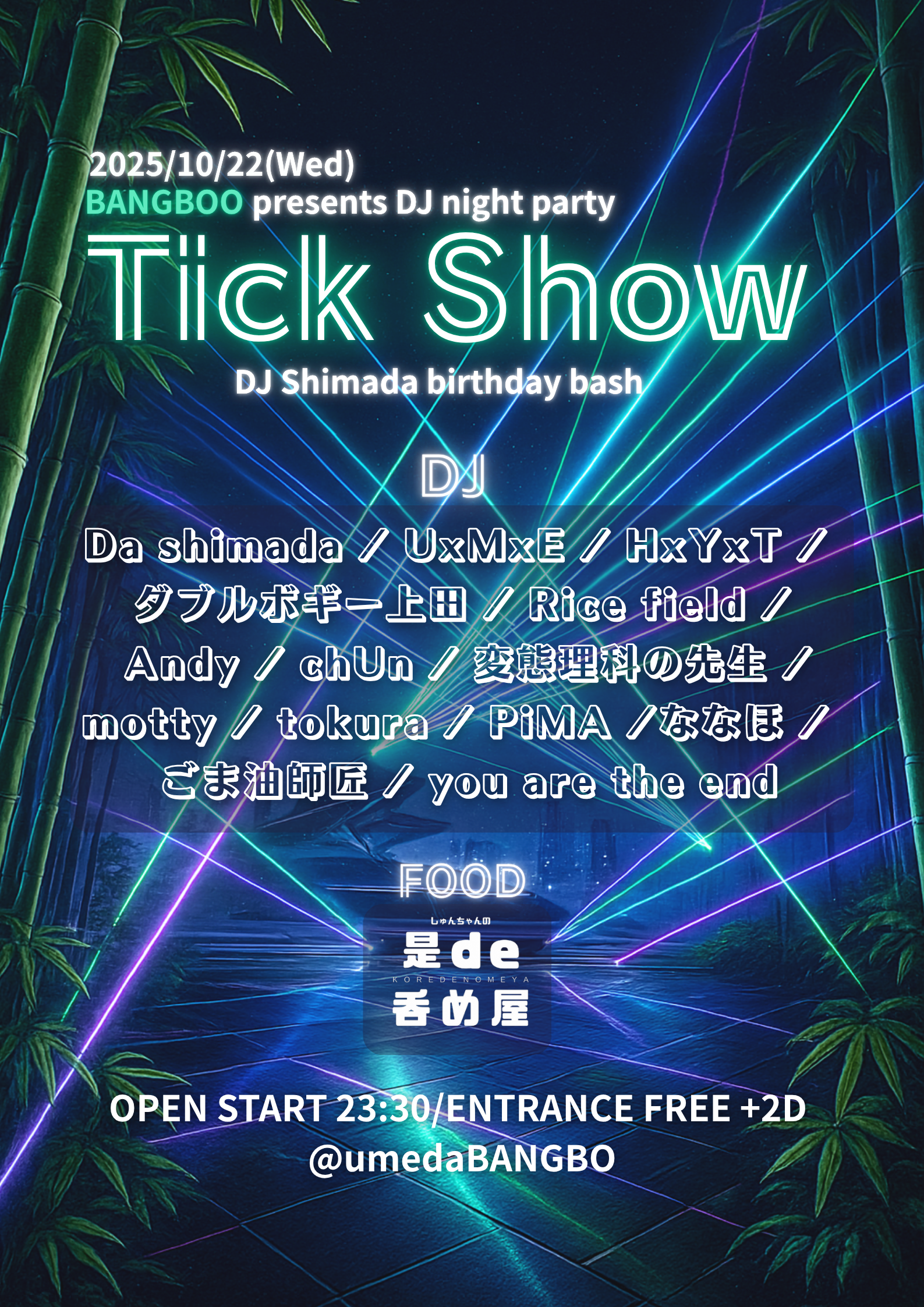 梅田 BANGBOO スケジュール 2025.10.22(Wed) Tick Show [ACT] Da shimada / UxMxE / HxYxT / ダブルボギー上田 / Rice field / Andy / chUn / 変態理科の先生 / motty / tokura / ななほ / PiMA / ごま油師匠 / you are the end [OPEN/START] 23:30 [料金] ADV./DOOR ¥/¥別途Drink代¥700 会場販売:無 (問)梅田BANGBOO info@bangboo.jp 06-6867-7828 〒530-0027 大阪府大阪市北区堂山町6-5 ペンギンスクエアビルB1F、B2F