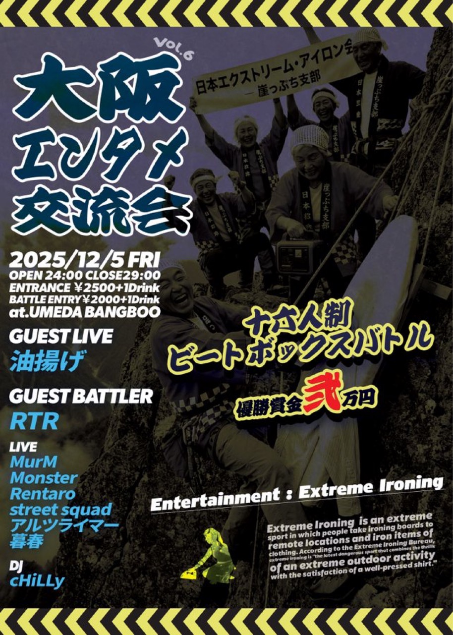 梅田 BANGBOO スケジュール 2025.12.05(Fri) 大阪エンタメ交流会 [ACT] MurM / Monster / Rentaro / street squad / アルツライマー / 暮春 / 【DJ】 cHiLLy 【guest live】 油揚げ / 16人制beatbox battle [OPEN/START] 24:00 [料金] door2500+1D / バトルエントリー2000+1Dで 会場販売:無 (問)梅田BANGBOO info@bangboo.jp 06-6867-7828 〒530-0027 大阪府大阪市北区堂山町6-5 ペンギンスクエアビルB1F、B2F