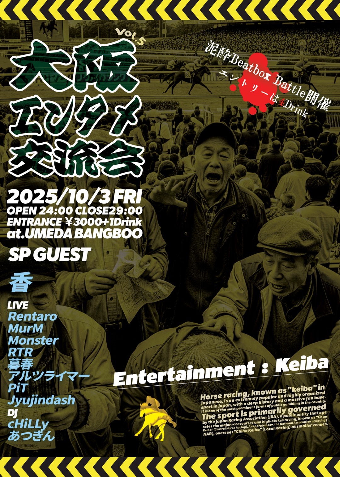 梅田 BANGBOO スケジュール 2025.10.03(Fri) 大阪エンタメ交流会 [ACT] <LIVE> Rentaro / MurM / Monster / RTR / 暮春 / アルツライマー / PiT / Jyujindash / <DJ> cHiLLy / あつきん [OPEN/START] 24:00 [料金] ADV./DOOR ¥/¥別途Drink代¥700 会場販売:無 (問)梅田BANGBOO info@bangboo.jp 06-6867-7828 〒530-0027 大阪府大阪市北区堂山町6-5 ペンギンスクエアビルB1F、B2F