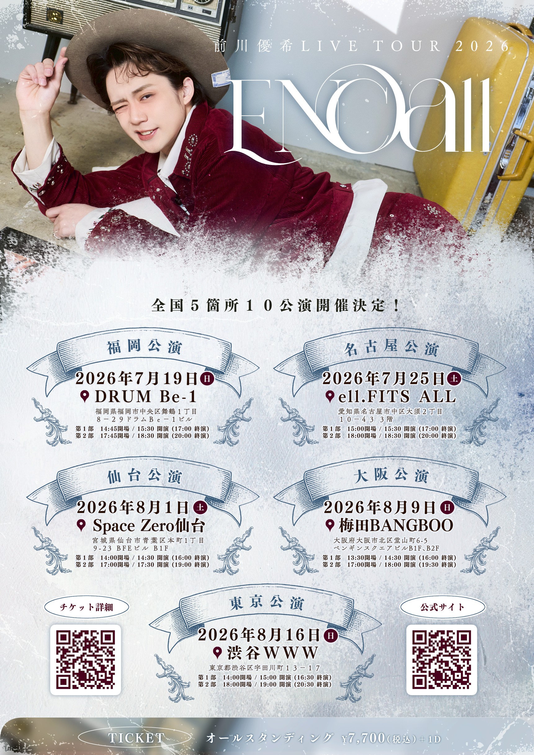 梅田 BANGBOO スケジュール 2026.8.09(Sun) 前川優希 LIVE TOUR 2026 「ENcall」 [ACT] 前川優希 / TëKMO+(O.A.) [OPEN/START] 第⼀部 第⼆部 13:30開場 / 14:30 開演 (16:00 終演) 17:00開場 / 18:00 開演 (19:30 終演) [料金] ADV./DOOR ¥7,700/¥---別途Drink代¥700 会場販売:無 (問)info@sieg-en.com 〒530-0027 大阪府大阪市北区堂山町6-5 ペンギンスクエアビルB1F、B2F FC会員先⾏(抽選): ZAIKOにて券売 当落発表: ⼊⾦⾦期限: 主催 株式会社NAGISA 企画・制作・票券 株式会社ジーク・エンターテインメント