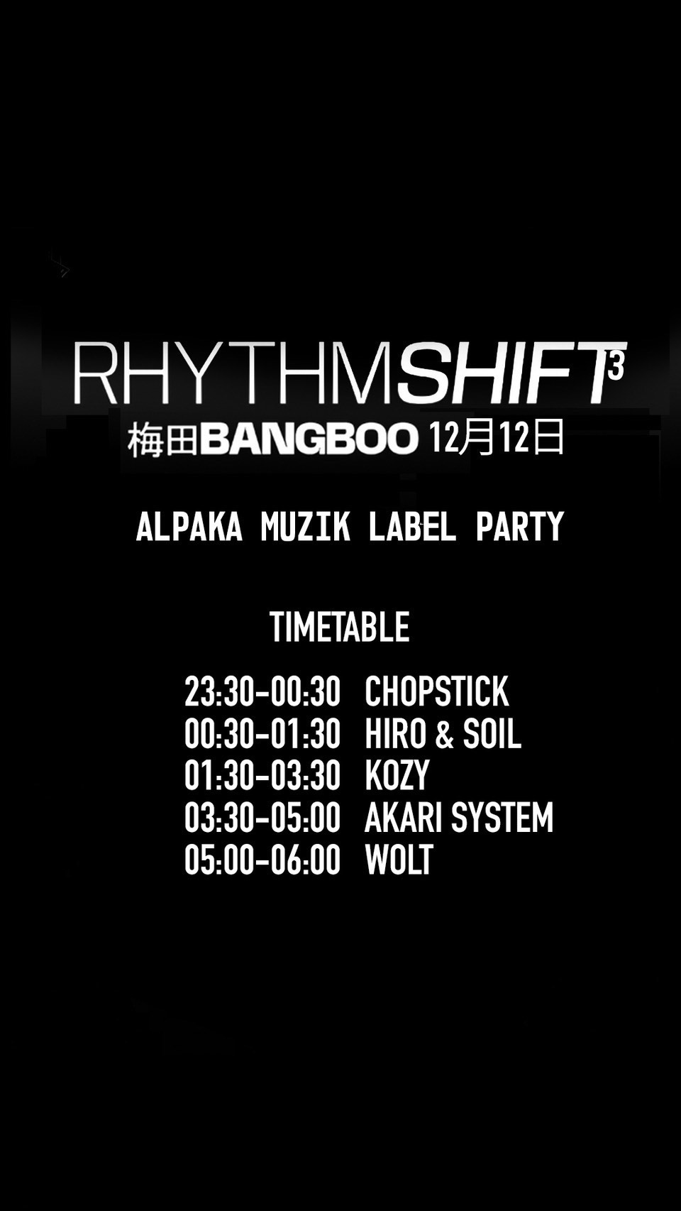 - 【HeadLiner】 KOZY (AlpaKa MuziK) 【Release Artist】AKARI SYSTEM (AlpaKa MuziK) 【Special B2B】 Hiro & SOIL (Magichour Recordings) 【RHYTHM SHIFT DJs】Chopstick (Mindscape Records) / WOLT (Magichour Recordings)