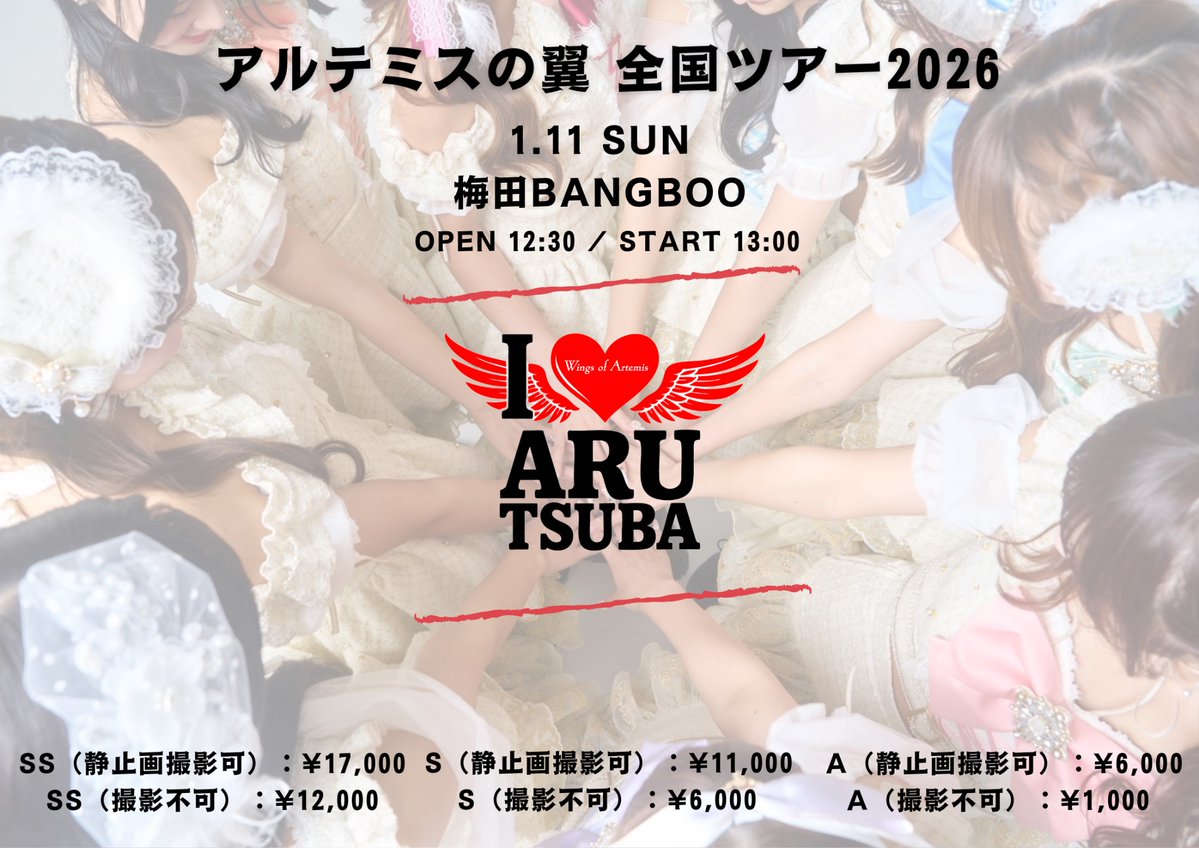 梅田 BANGBOO スケジュール 2026.1.11(Sun) 「I ❤ ARUTSUBA~大阪公演~」 [ACT] アルテミスの翼 [OPEN/START] 12:30/13:00 [料金] SS(静止画撮影可):¥17,000 SS(撮影不可):¥12,000 S(静止画撮影可):¥11,000 S(撮影不可):¥6,000 A(静止画撮影可):¥6,000 A(撮影不可):¥1,000別途Drink代¥700 SS(静止画撮影可):¥17,000 SS(撮影不可):¥12,000 ・最前確約 ・特典会ファストパス 特典①:ご当地被り物推しメンランチェキ(日付、サイン付) 特典②:ご当地被り物集合ブロマイド 特典③:集合ワイドor集合写メ S(静止画撮影可):¥11,000 S(撮影不可):¥6,000 ・前方 特典:ご当地被り物ランチェキ A(静止画撮影可):¥6,000 A(撮影不可):¥1,000 入場順:SS(静止画撮影可)→SS(撮影不可)→S(静止画撮影可)→S(撮影不可)→A(静止画撮影可)→A(撮影不可)