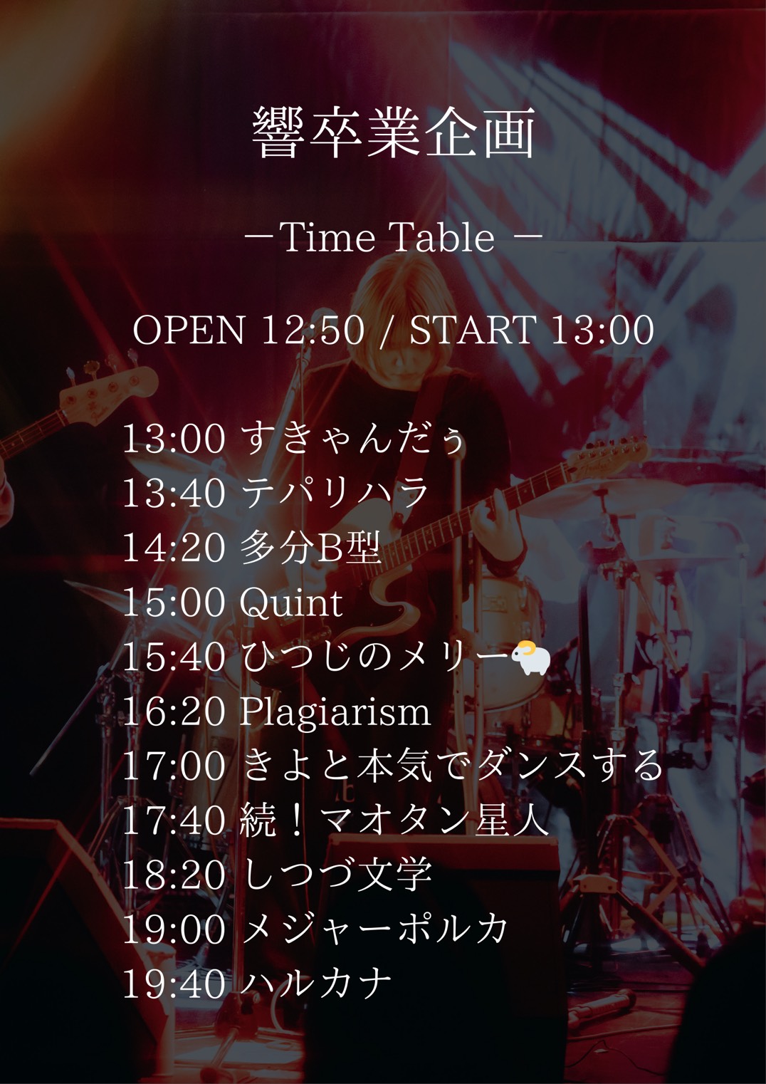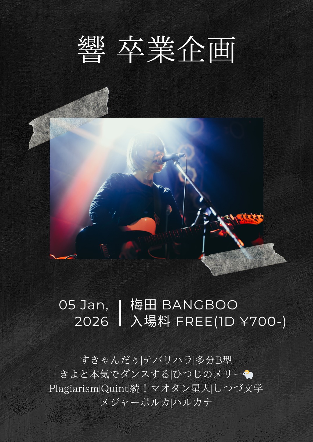 梅田 BANGBOO スケジュール 2026.1.05(Mon) 響卒業企 [ACT] すきゃんだう|テパリハラ|多分B型 きょと本気でダンスする|ひつじのメリー / PlagiarismIQuint続!マオタン星人つづ文学 メジャーポルカハルカナ [OPEN/START] OPEN 12:50 / START 13:00 [料金] FREEEEEEEE別途Drink代¥700 会場販売:無 (問)梅田BANGBOO info@bangboo.jp 06-6867-7828 〒530-0027 大阪府大阪市北区堂山町6-5 ペンギンスクエアビルB1F、B2F