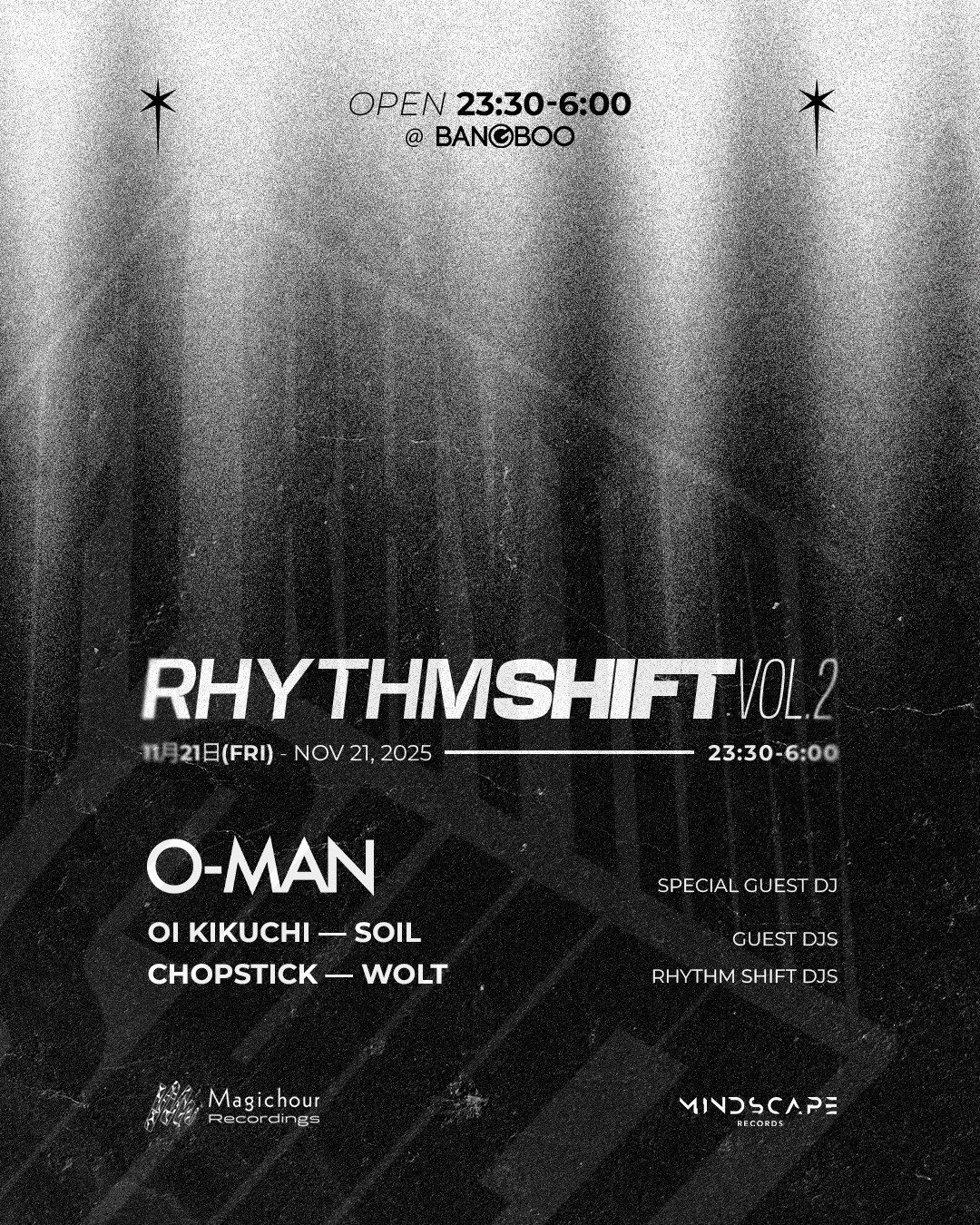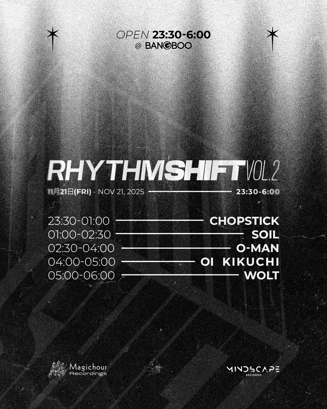 - 【Special Guest DJ】 O-MAN 【Guest DJs】Oi Kikuchi / SOIL (Magichour Recordings) 【RHYTHM SHIFT DJs】Chopstick (Mindscape Records)WOLT (Magichour Recordings)