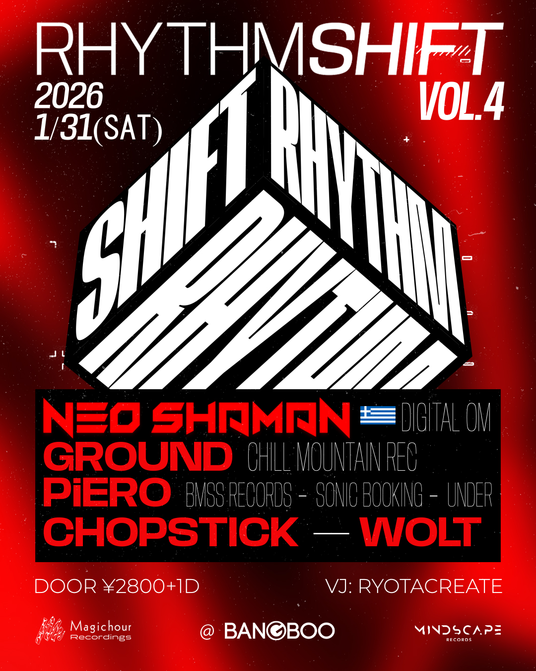 A full-night journey that begins with Techno,moves through Psytech / Tech House,and finishes with Psytrance. Featuring international guest Neo Shaman (Digital Om),alongside Ground (Chill Mountain Rec)and PiERO (BMSS Records / Sonic Booking / UNDER). A truly luxurious lineup where artists of different genres,backgrounds, and careers converge on one floor —the latest chapter of RHYTHM SHIFT. The first RHYTHM SHIFT of 2026.Experience this night on the dancefloor. RHYTHM SHIFT - Vol.4