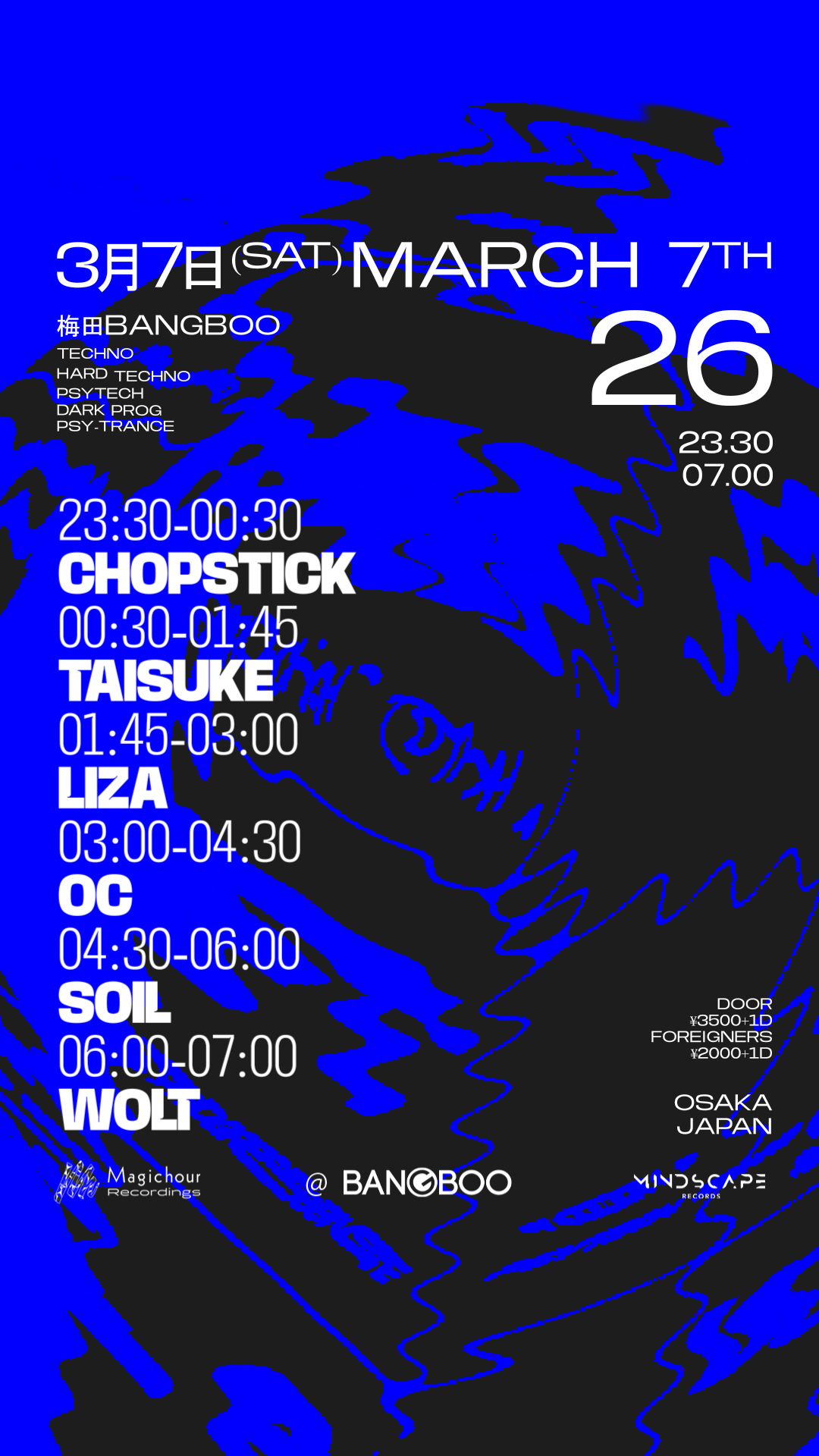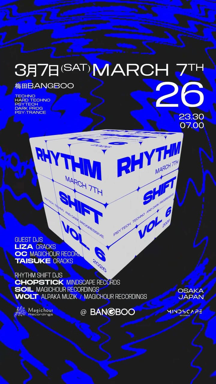 - 【Guest DJs】 LIZA (CRACKS) OC (Magichour Recordings / stoic camp) taisuke (CRACKS) 【RHYTHM SHIFT DJs】 Chopstick (Mindscape Records) SOIL (Magichour Recordings)WOLT (AlpaKa MuziK / Magichour Recordings)